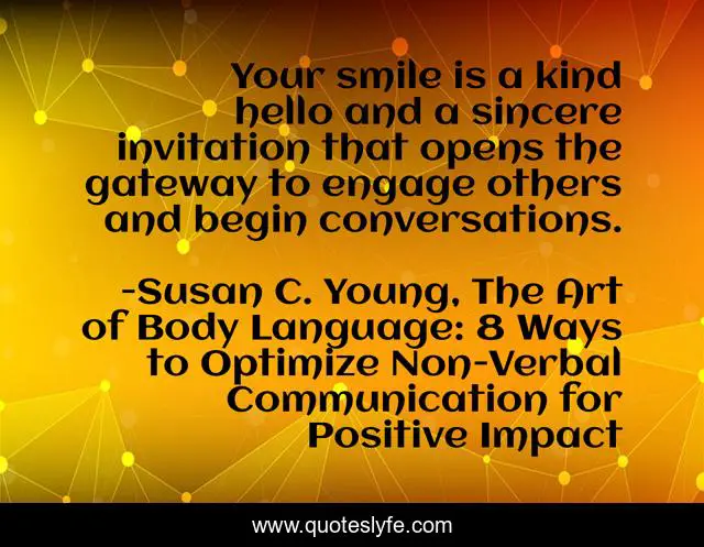 "Susan C. Young, The Art of Body Language: 8 Ways to Optimize Non-Verbal Communication for Positive Impact Quotes." Quoteslyfe.com, 2025. Fri. 05 Dec. 2025. <https://www.quoteslyfe.com/quote/Your-smile-is-a-kind-hello-and-233510>.