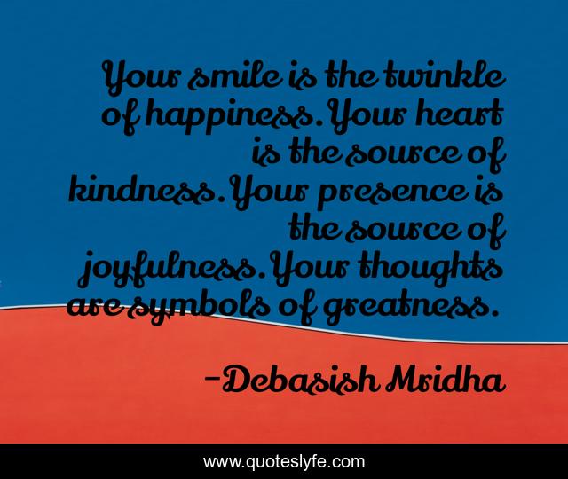 This page presents the quote "Your smile is the twinkle of happiness.Your heart is the source of kindness.Your presence is the source of joyfulness.Your thoughts are symbols of greatness.". Author of this quote is Debasish Mridha. This quote is about heart, life, education, love, knowledge, presence, joyfulness, intelligence, philosophy,.
