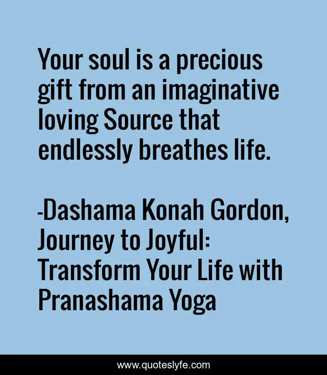 This page presents the quote "Your soul is a precious gift from an imaginative loving Source that endlessly breathes life.". Author of this quote is Dashama Konah Gordon, Journey to Joyful: Transform Your Life with Pranashama Yoga. This quote is about inspiring, yoga, spirituality, health, inspirational, enthusiasm,.