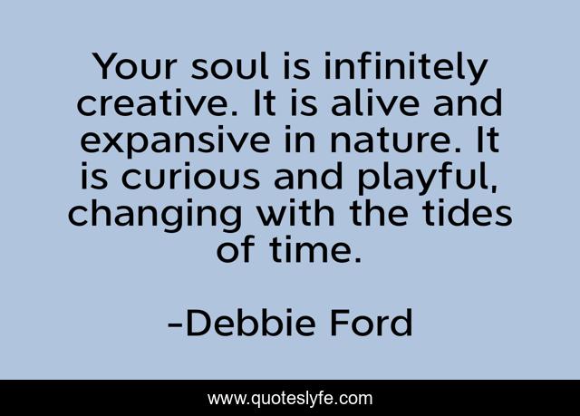 This page presents the quote "Your soul is infinitely creative. It is alive and expansive in nature. It is curious and playful, changing with the tides of time.". Author of this quote is Debbie Ford. This quote is about time, soul, creative,.