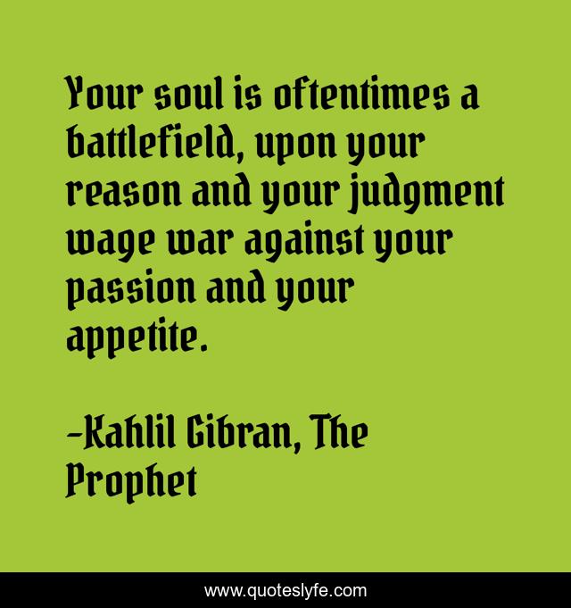 This page presents the quote "Your soul is oftentimes a battlefield, upon your reason and your judgment wage war against your passion and your appetite.". Author of this quote is Kahlil Gibran, The Prophet. This quote is about reason-and-judgment, the-prophet, passion, soul, khalil-gibran,.