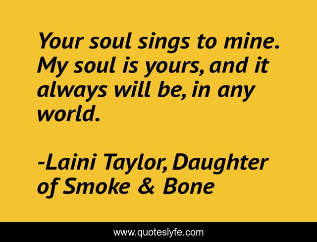 This page presents the quote "Your soul sings to mine. My soul is yours, and it always will be, in any world.". Author of this quote is Laini Taylor, Daughter of Smoke & Bone. This quote is about akiva, fantasy, daughter-of-smoke-and-bone, karou,.