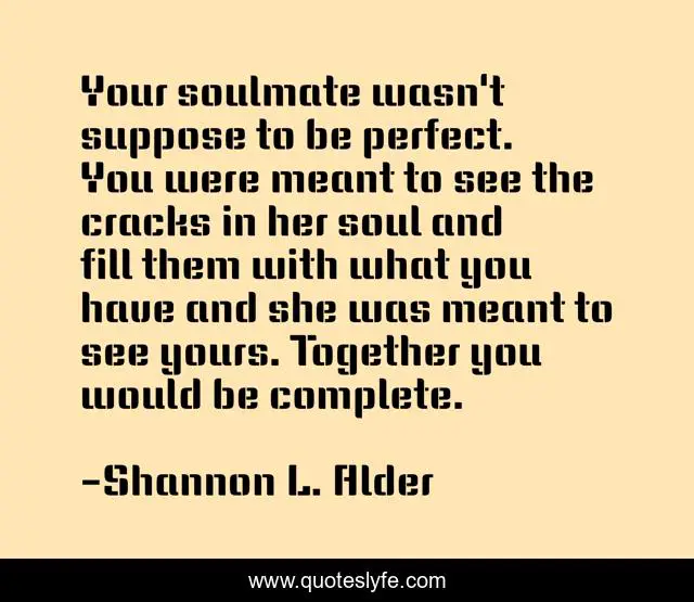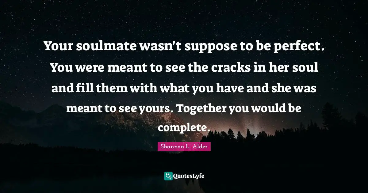 This page presents the quote "Your soulmate wasn't suppose to be perfect. You were meant to see the cracks in her soul and fill them with what you have and she was meant to see yours. Together you would be complete.". Author of this quote is Shannon L. Alder. This quote is about perfect, cracks, flaws, flawed, idiot, angry, selfish-relationships-101, mistakes, together,.