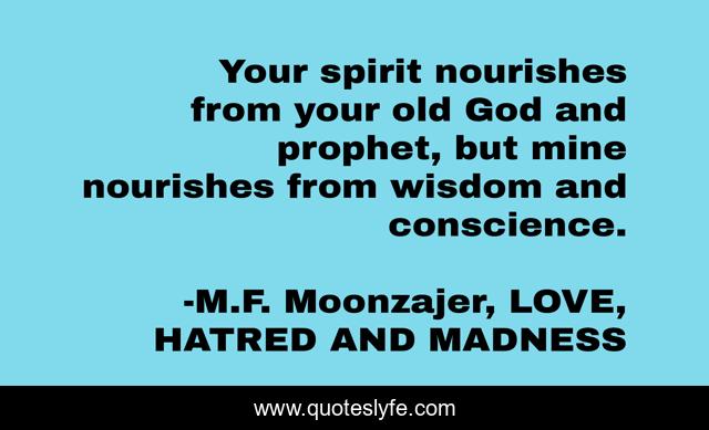 This page presents the quote "Your spirit nourishes from your old God and prophet, but mine nourishes from wisdom and conscience.". Author of this quote is M.F. Moonzajer, LOVE, HATRED AND MADNESS. This quote is about conscience, nourish, god, mine, wisdom, prophet, spirit,.