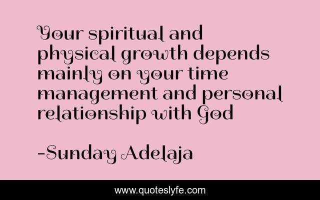 This page presents the quote "Your spiritual and physical growth depends mainly on your time management and personal relationship with God". Author of this quote is Sunday Adelaja. This quote is about spiritual-growth, life, blessing, finance, jobless, job, money, work, spiritual,.
