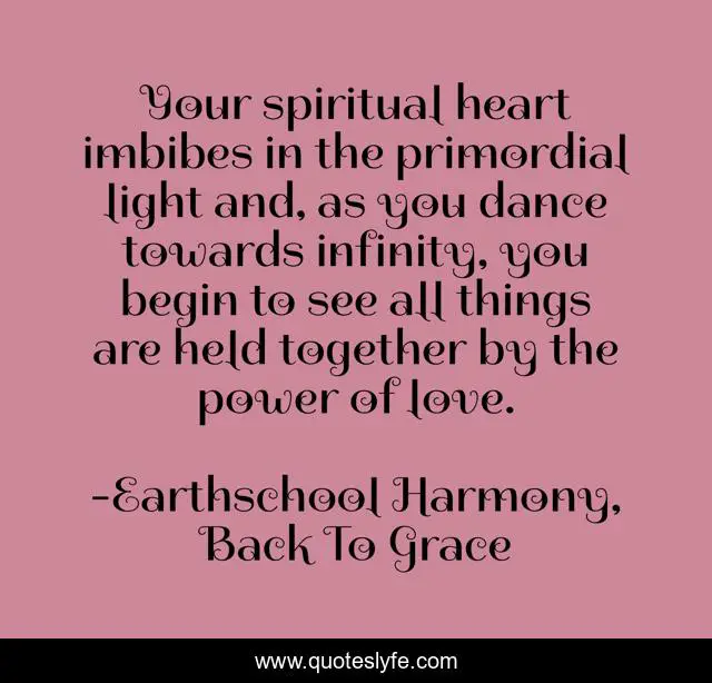 This page presents the quote "Your spiritual heart imbibes in the primordial light and, as you dance towards infinity, you begin to see all things are held together by the power of love.". Author of this quote is Earthschool Harmony, Back To Grace. This quote is about love, spiritual, infinity, awakes, consciousness, mindfulness, dance, light, earthschool-harmony,.