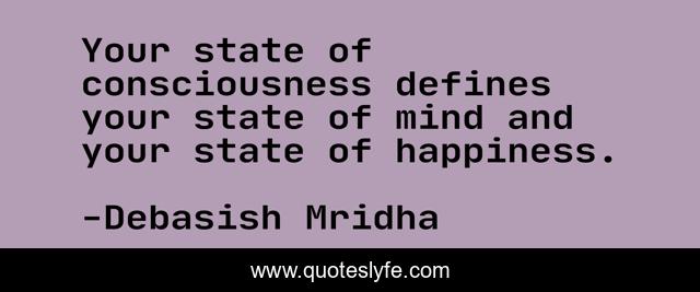This page presents the quote "Your state of consciousness defines your state of mind and your state of happiness.". Author of this quote is Debasish Mridha. This quote is about consciousness, quotes, philosophy, debasish-mridha, state-of-happiness, inspirational, state-of-mind, enthusiasm, debasish-mridha-m-d,.
