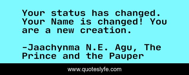 "Jaachynma N.E. Agu, The Prince and the Pauper Quotes." Quoteslyfe.com, 2025. Sat. 06 Dec. 2025. <https://www.quoteslyfe.com/quote/Your-status-has-changed-Your-Name-is-28821>.