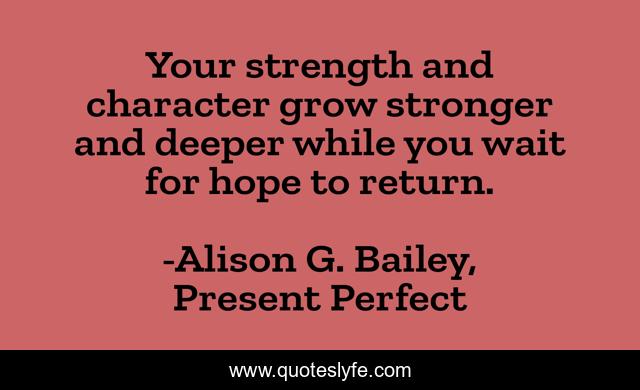 This page presents the quote "Your strength and character grow stronger and deeper while you wait for hope to return.". Author of this quote is Alison G. Bailey, Present Perfect. This quote is about strength, experience, hope,.