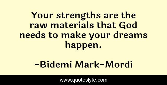 This page presents the quote "Your strengths are the raw materials that God needs to make your dreams happen.". Author of this quote is Bidemi Mark-Mordi. .