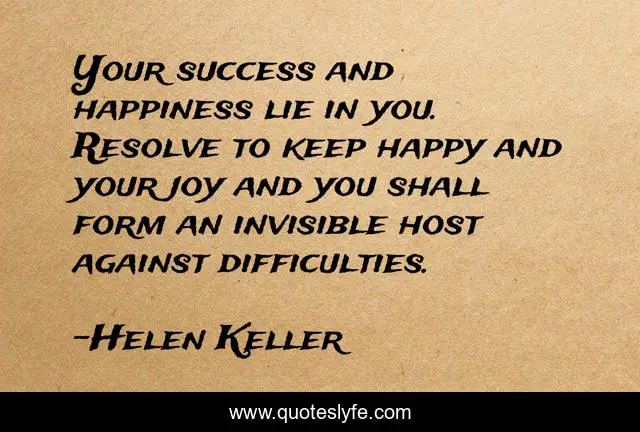 This page presents the quote "Your success and happiness lie in you. Resolve to keep happy and your joy and you shall form an invisible host against difficulties.". Author of this quote is Helen Keller. .