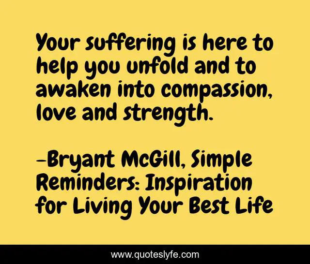 This page presents the quote "Your suffering is here to help you unfold and to awaken into compassion, love and strength.". Author of this quote is Bryant McGill, Simple Reminders: Inspiration for Living Your Best Life. This quote is about compassion, suffering, strength, love, affection,.