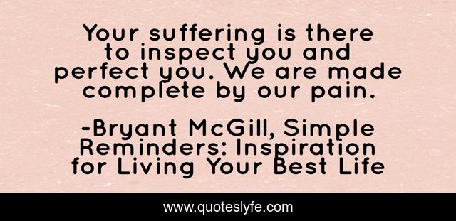 This page presents the quote "Your suffering is there to inspect you and perfect you. We are made complete by our pain.". Author of this quote is Bryant McGill, Simple Reminders: Inspiration for Living Your Best Life. This quote is about completeness, suffering, pain, perfection,.