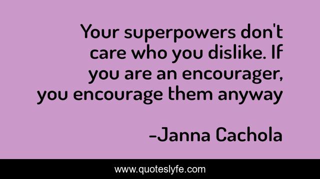 This page presents the quote "Your superpowers don't care who you dislike. If you are an encourager, you encourage them anyway". Author of this quote is Janna Cachola. This quote is about gifts, encourager, leadership, team-builder, team,.