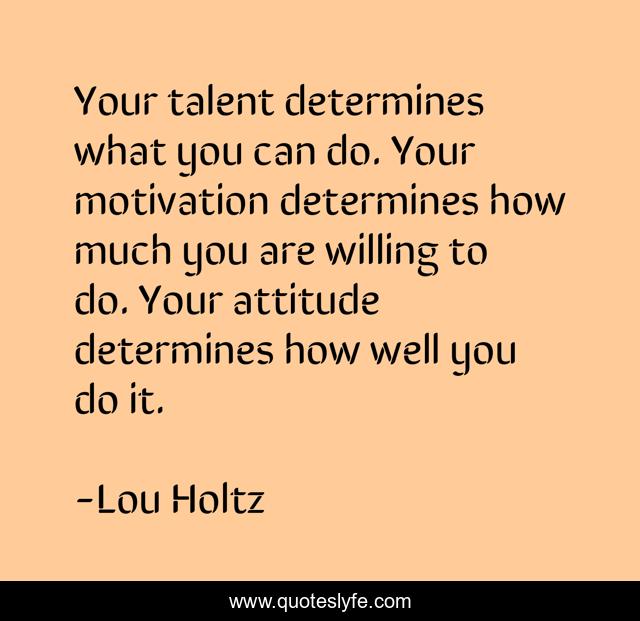 This page presents the quote "Your talent determines what you can do. Your motivation determines how much you are willing to do. Your attitude determines how well you do it.". Author of this quote is Lou Holtz. This quote is about motivation, football, talent,.