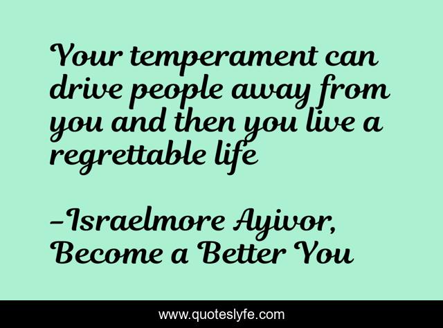 This page presents the quote "Your temperament can drive people away from you and then you live a regrettable life". Author of this quote is Israelmore Ayivor, Become a Better You. This quote is about living, food-for-thought, regret, better-you, successful, angry, companions, israelmore-ayivor, life,.