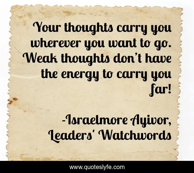 This page presents the quote "Your thoughts carry you wherever you want to go. Weak thoughts don’t have the energy to carry you far!". Author of this quote is Israelmore Ayivor, Leaders' Watchwords. This quote is about food-for-thought, negative-thinking, thinking, energy, ideas, choices, positive-thinking, carry, israelmore-ayivor,.