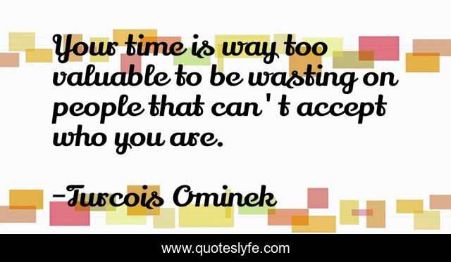 This page presents the quote "Your time is way too valuable to be wasting on people that can't accept who you are.". Author of this quote is Turcois Ominek. This quote is about life, inspirational, letting-go, believe-in-yourself, self-love, values, life-lessons, attitude-toward-life, enthusiasm,.