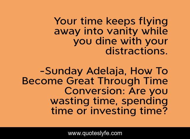 This page presents the quote "Your time keeps flying away into vanity while you dine with your distractions.". Author of this quote is Sunday Adelaja, How To Become Great Through Time Conversion: Are you wasting time, spending time or investing time?. This quote is about distractions, life, conversion, productivity, wealth, greatness, waste, humanity, product,.