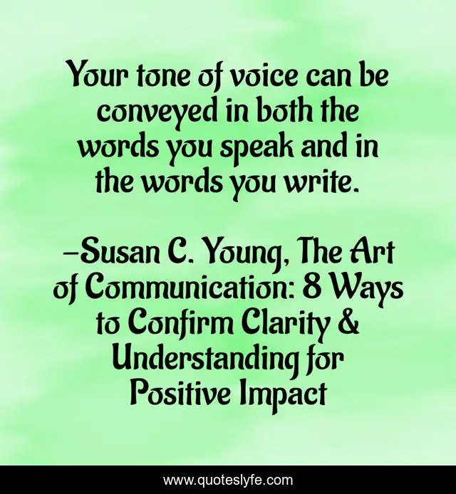 "Susan C. Young, The Art of Communication: 8 Ways to Confirm Clarity & Understanding for Positive Impact Quotes." Quoteslyfe.com, 2025. Sun. 07 Dec. 2025. <https://www.quoteslyfe.com/quote/Your-tone-of-voice-can-be-conveyed-233414>.