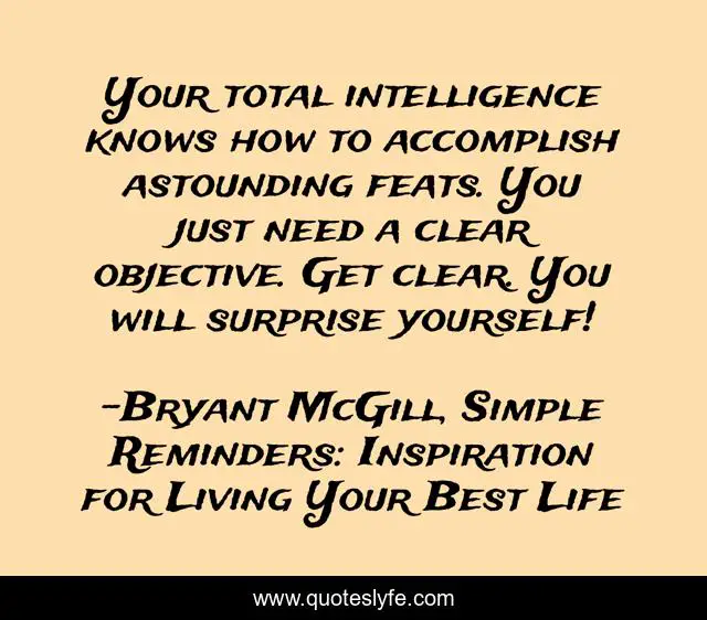 This page presents the quote "Your total intelligence knows how to accomplish astounding feats. You just need a clear objective. Get clear. You will surprise yourself!". Author of this quote is Bryant McGill, Simple Reminders: Inspiration for Living Your Best Life. This quote is about knowing, focus, accomplishments, growth, astonishment, meditation,.