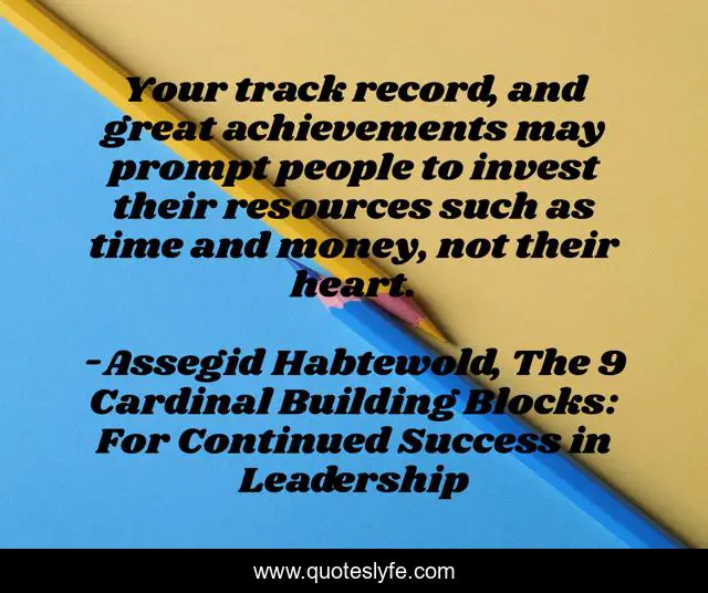 This page presents the quote "Your track record, and great achievements may prompt people to invest their resources such as time and money, not their heart.". Author of this quote is Assegid Habtewold, The 9 Cardinal Building Blocks: For Continued Success in Leadership. This quote is about achievements, heart, trust, track-record,.