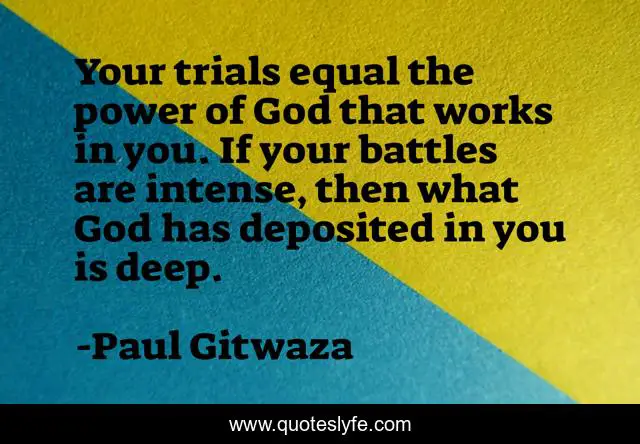 This page presents the quote "Your trials equal the power of God that works in you. If your battles are intense, then what God has deposited in you is deep.". Author of this quote is Paul Gitwaza. This quote is about life, power-of-god, god, work, born-again, resurrection-of-jesus, inspirational, church, enthusiasm,.