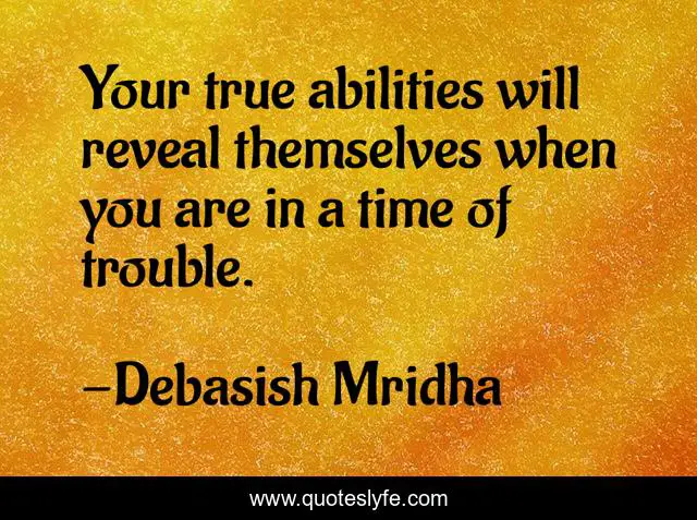 This page presents the quote "Your true abilities will reveal themselves when you are in a time of trouble.". Author of this quote is Debasish Mridha. This quote is about time-of-trouble, life-wisdom, philosophy, debasish-mridha, quotes, inspirational, enthusiasm, debasish-mridha-m-d, true-abilities,.