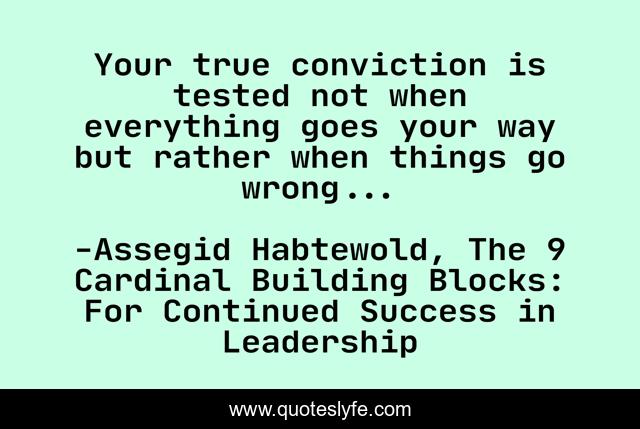 This page presents the quote "Your true conviction is tested not when everything goes your way but rather when things go wrong...". Author of this quote is Assegid Habtewold, The 9 Cardinal Building Blocks: For Continued Success in Leadership. This quote is about test, wrong, thing-go-right, conviction,.