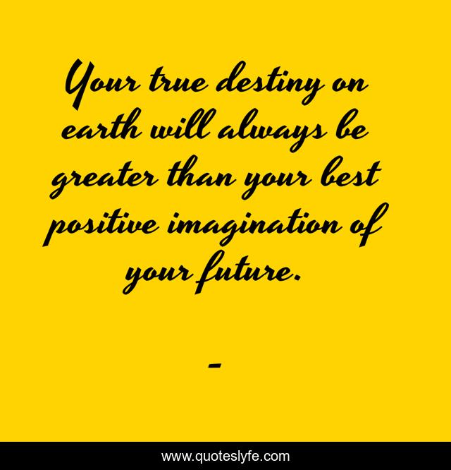 This page presents the quote "Your true destiny on earth will always be greater than your best positive imagination of your future.". Author of this quote is . This quote is about your-best-imagination, edmond-mbiaka, your-true-destiny, your-destiny-on-earth, the-imagination-your-future, your-positive-imagination,.