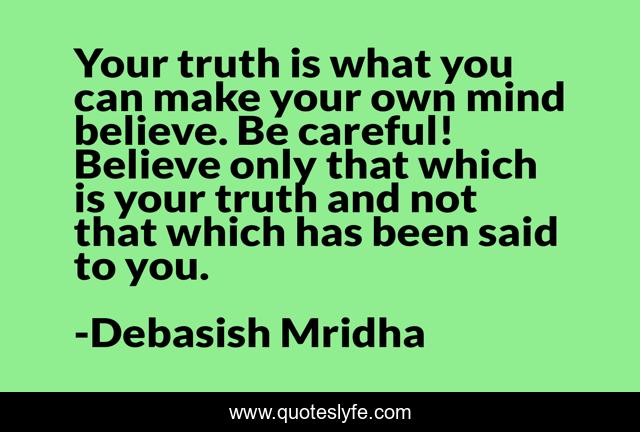 This page presents the quote "Your truth is what you can make your own mind believe. Be careful! Believe only that which is your truth and not that which has been said to you.". Author of this quote is Debasish Mridha. This quote is about be-careful, your-truth, inspirational, make-your-mind-believe, philosophy, debasish-mridha, quotes, debasish-mridha-md, truth,.