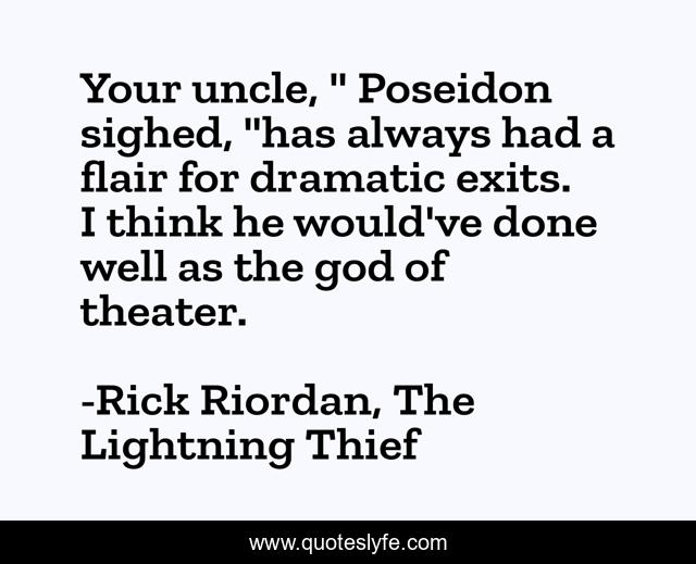 This page presents the quote "Your uncle, " Poseidon sighed, "has always had a flair for dramatic exits. I think he would've done well as the god of theater.". Author of this quote is Rick Riordan, The Lightning Thief. This quote is about zeus, percy-jackson, poseidon,.