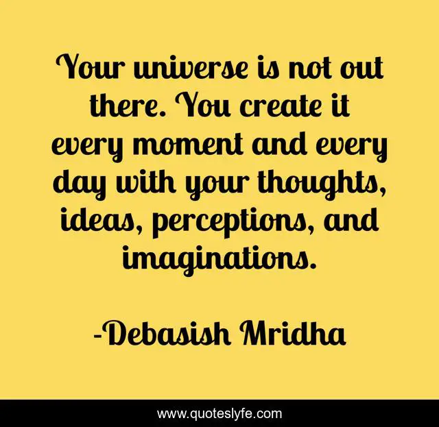 This page presents the quote "Your universe is not out there. You create it every moment and every day with your thoughts, ideas, perceptions, and imaginations.". Author of this quote is Debasish Mridha. This quote is about the-universe-is-in-you, your-universe-is-not-out-there, philosophy, debasish-mridha, quotes, debasish-mridha-md, inspirational, enthusiasm, create-every-moment-and-everyday,.