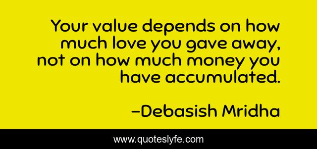 This page presents the quote "Your value depends on how much love you gave away, not on how much money you have accumulated.". Author of this quote is Debasish Mridha. This quote is about life, love, knowledge, inspirational, intelligence, philosophy, wisdom, quotes, affection,.