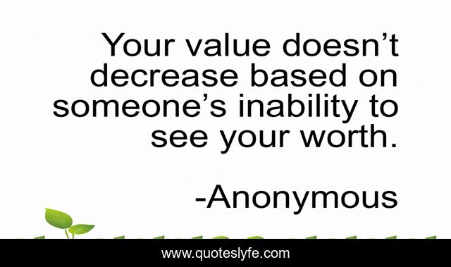 This page presents the quote "Your value doesn’t decrease based on someone’s inability to see your worth.". Author of this quote is Anonymous. This quote is about enthusiasm, inspirational, self-worth,.
