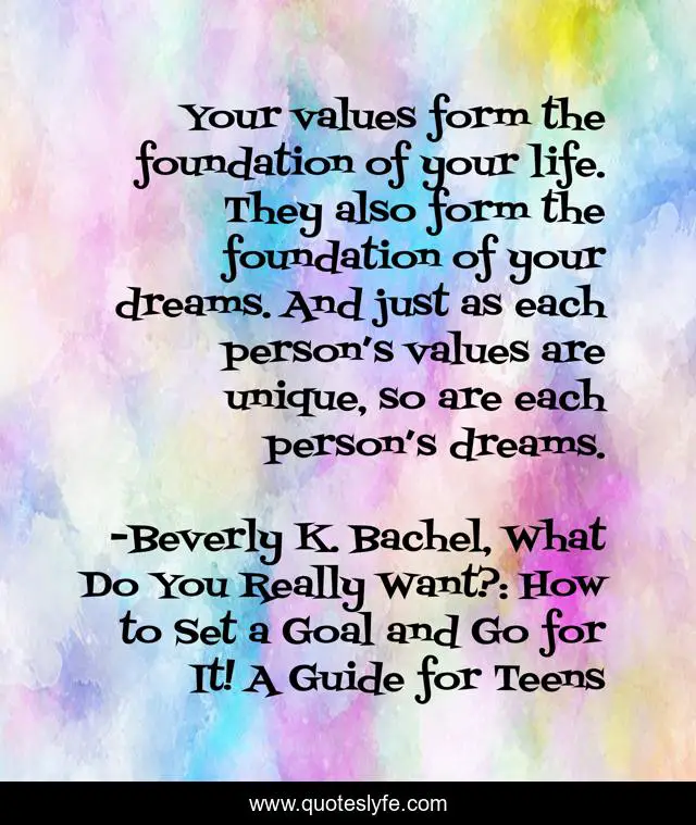 This page presents the quote "Your values form the foundation of your life. They also form the foundation of your dreams. And just as each person’s values are unique, so are each person’s dreams.". Author of this quote is Beverly K. Bachel, What Do You Really Want?: How to Set a Goal and Go for It! A Guide for Teens. This quote is about teen, nonfiction, inspirational, enthusiasm, nonfiction-self-help, young-adult,.