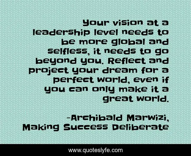 This page presents the quote "Your vision at a leadership level needs to be more global and selfless, it needs to go beyond you. Reflect and project your dream for a perfect world, even if you can only make it a great world.". Author of this quote is Archibald Marwizi, Making Success Deliberate. This quote is about behaviour, attitude, balanced-life, benchmarking,.