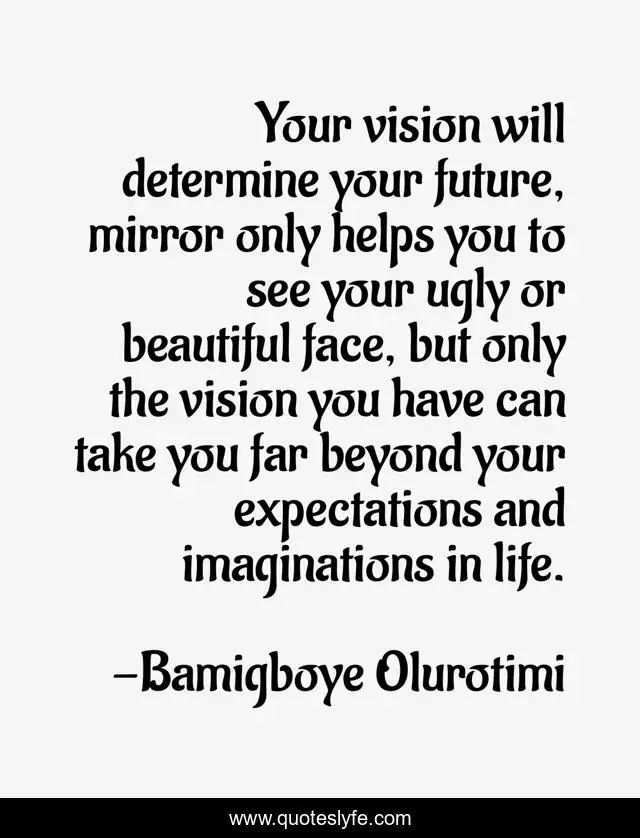 This page presents the quote "Your vision will determine your future, mirror only helps you to see your ugly or beautiful face, but only the vision you have can take you far beyond your expectations and imaginations in life.". Author of this quote is Bamigboye Olurotimi. This quote is about beautiful, life, beyond, ugly, far, ambition, expectations, face, imagination,.
