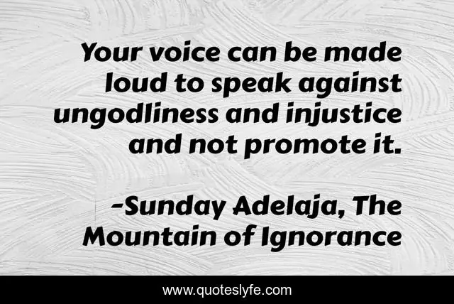 This page presents the quote "Your voice can be made loud to speak against ungodliness and injustice and not promote it.". Author of this quote is Sunday Adelaja, The Mountain of Ignorance. This quote is about mountain, life, darkness, power, danger, speak-out, god, people, ignorance,.