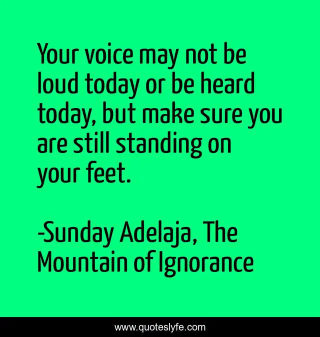 This page presents the quote "Your voice may not be loud today or be heard today, but make sure you are still standing on your feet.". Author of this quote is Sunday Adelaja, The Mountain of Ignorance. This quote is about mountain, feet-on-the-ground, strength, darkness, power, danger, god, people, life,.