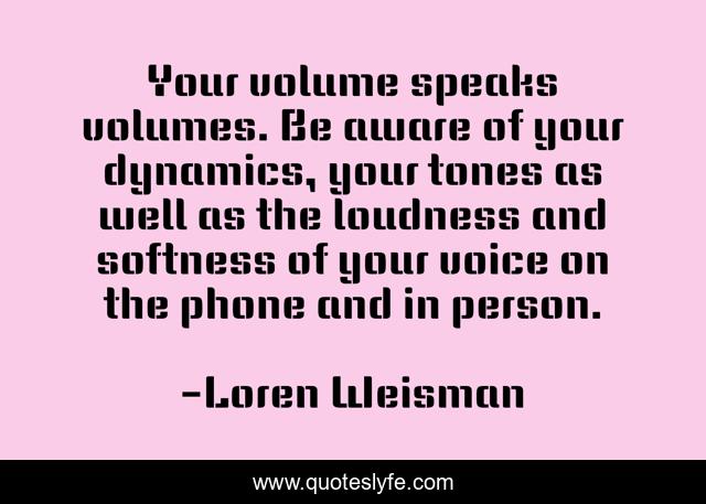 This page presents the quote "Your volume speaks volumes. Be aware of your dynamics, your tones as well as the loudness and softness of your voice on the phone and in person.". Author of this quote is Loren Weisman. This quote is about loren-weisman, life, tone, success, branding-speaker, philosophy, volume, quotes, voice,.