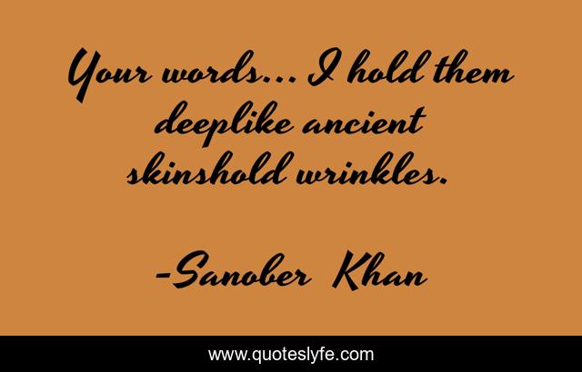 This page presents the quote "Your words... I hold them deeplike ancient skinshold wrinkles.". Author of this quote is Sanober Khan. This quote is about poets, literature, poetry, deep, words, poetry-love,.