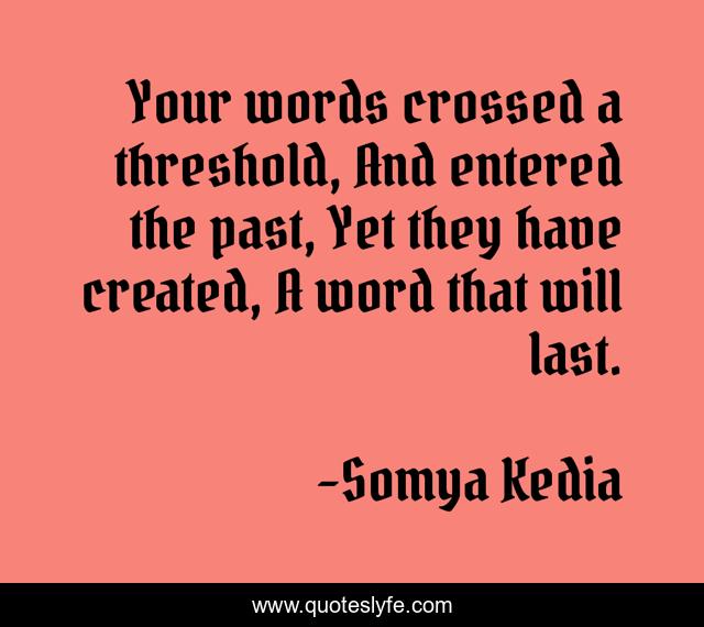 This page presents the quote "Your words crossed a threshold, And entered the past, Yet they have created, A word that will last.". Author of this quote is Somya Kedia. This quote is about past, words, memory,.