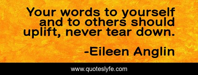 This page presents the quote "Your words to yourself and to others should uplift, never tear down.". Author of this quote is Eileen Anglin. This quote is about uplift-others, self-love, kindness, self-esteem,.