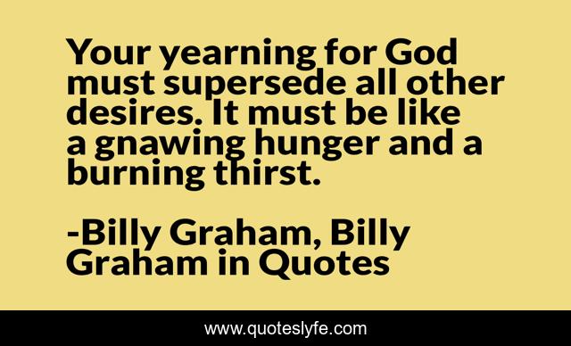 This page presents the quote "Your yearning for God must supersede all other desires. It must be like a gnawing hunger and a burning thirst.". Author of this quote is Billy Graham, Billy Graham in Quotes. This quote is about god, billy-graham,.