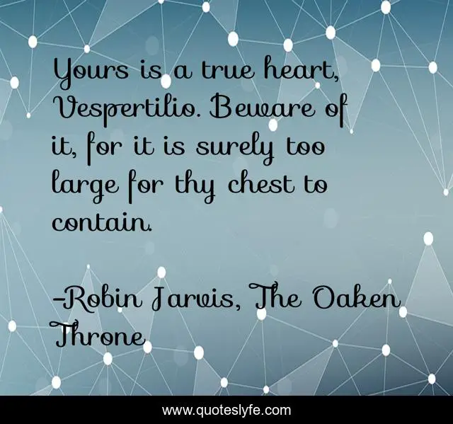 This page presents the quote "Yours is a true heart, Vespertilio. Beware of it, for it is surely too large for thy chest to contain.". Author of this quote is Robin Jarvis, The Oaken Throne. This quote is about heart, beware,.