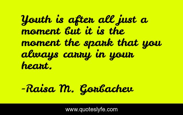 This page presents the quote "Youth is after all just a moment but it is the moment the spark that you always carry in your heart.". Author of this quote is Raisa M. Gorbachev. .