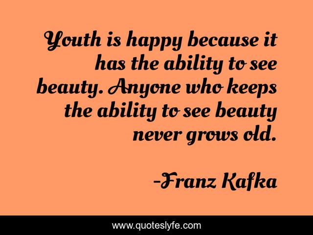 This page presents the quote "Youth is happy because it has the ability to see beauty. Anyone who keeps the ability to see beauty never grows old.". Author of this quote is Franz Kafka. This quote is about youth, see, happy,.