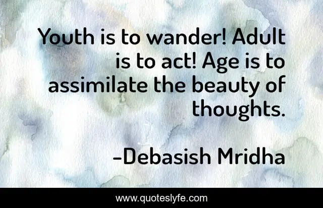This page presents the quote "Youth is to wander! Adult is to act! Age is to assimilate the beauty of thoughts.". Author of this quote is Debasish Mridha. This quote is about life, love, knowledge, beauty, assimilate, intelligence, age, philosophy, wisdom,.