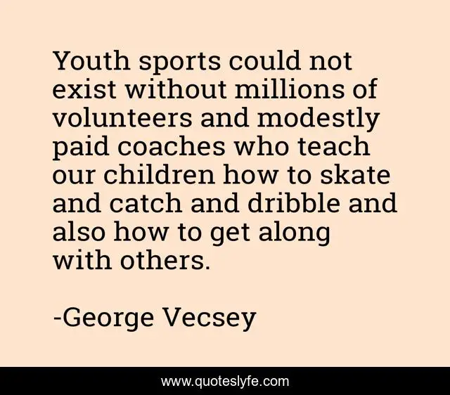 This page presents the quote "Youth sports could not exist without millions of volunteers and modestly paid coaches who teach our children how to skate and catch and dribble and also how to get along with others.". Author of this quote is George Vecsey. This quote is about youth, teach, children,.